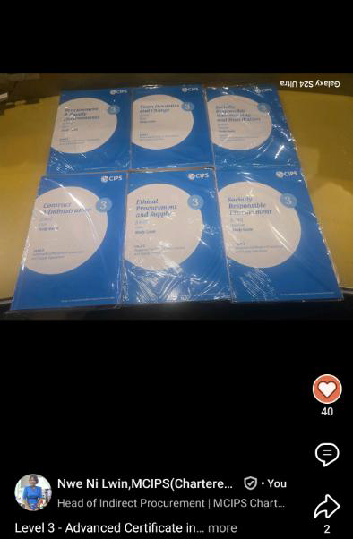 ကျွန်မရဲ့ first batch CIPS Level 2 Certificate in Procurement and Supply Operations မှာတက်ကြတယ့်အတန်းသား၊အတန်းသူ (၃၇) ယောက်ဟာ နိုင်ငံခြားမှ တက်ကြသူများUK, Dubai, Thailand၊Singapore၊Japan နဲ့မြန်မာပြည်မှာတင် ရန်ကုန်၊နေပြည်တော်၊မန္တာလေး၊ရှမ်းပြည်နယ်မှ zoom meeting နဲ့သင်တာဖြစ်တဲ့အတွက် location Limitations မရှိပဲ တက်ရောက်နိုင်ပါတယ်၊ သင်တန်းကြေးထဲမှာလည်း စာအုပ်ဖိုးတွေပါတဲ့အတွက် စာအုပ်တွေကိုလည်းဝယ်ဖတ်စရာမလိုပါဘူး။