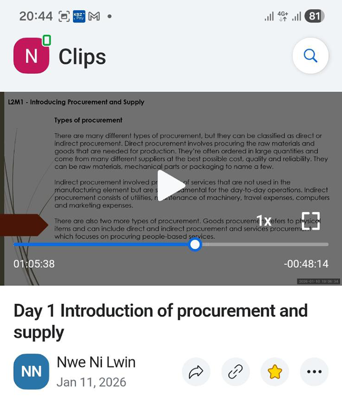 Second Batch - Level 2 Certificate in Procurement and Supply Operations ကို 25th April 2026 မှာဖွင့်လှစ်ပါမည်။သင်တန်းချိန်18hrs ကြာမြှင့်ပြီး 06 June 2026 တွင်ပြီးဆုံးပါမယ်။သင်တန်းအချိန်ကတော့စနေ့နှင့်တနင်္ဂနွေနေ့(5pm to 6:30pm)တွင် အောက်ပါအကြောင်းအရာများကိုသင်ပေးပါမယ်။